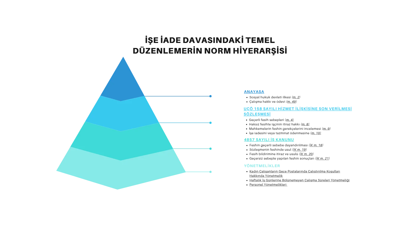 Türkiye’de işe iade davasını uygulamacılar iş hukuku bağlamında ele almaktadır. Bu dava, iş güvencesi esasına dayanmaktadır. Bu kapsamda; işe iade davası, Türk hukuk sisteminde birden fazla temel düzenlemelere dayanmakta ve birbirini tamamlayıcı ve etkileyici bir roldedir. Bu doğrultuda; kanun koyucunun işe iade davasındaki temel mevzuat normlar hiyerarşisine göre aşağıdaki gibidir: